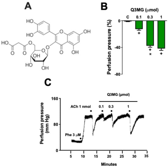 Q3MG promotes dose-dependent vasodilation in the mesenteric vascular bed of rats (MVBs). The chemical structure of Q3MG is shown in panel (A). The effects of Q3MG on the perfusion pressure in the MVBs are presented in panel (B). Trace recording of mesenteric vascular perfusion pressure showing the effects of acetylcholine (ACh) and Q3MG administration (C). Values in panel (B) are expressed as mean ± S.E.M. of six different preparations. The comparison with the control group and between the different doses of Q3MG was conducted through one-way ANOVA followed by the Bonferroni test. + indicates p < 0.05 compared with the control group (vehicle administration [PSS] in pre-contracted MVBs with Phe 3 µM). ⋇ Indicates p < 0.05 compared with Q3MG 0.1 µmol. All experiments were performed in endothelium-intact preparations.
