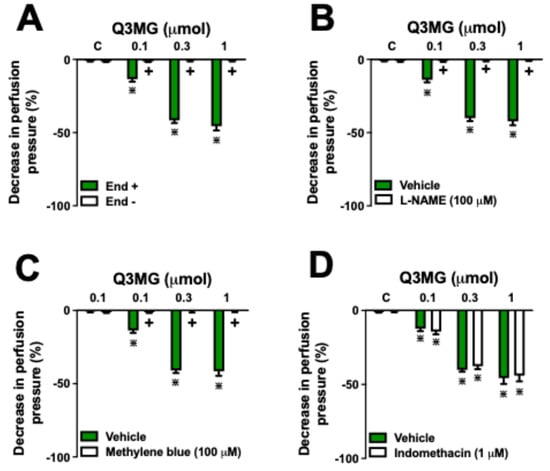 Treatment with sodium deoxycholate reduced the effects of ACh 1 nmol on the mesenteric vascular perfusion pressure by 95 ± 5%, confirming the efficacy of the chemical removal of endothelial function. Similarly, the chemical removal of the endothelium also reduced the vasodilatory effects of Q3MG (0.1, 0.3, and 1 µmol) by 97 ± 3% (Figure 4A). Moreover, the effects of all Q3MG doses were reduced by 98 ± 2% after prior perfusion with L-NAME (a non-selective nitric oxide synthase inhibitor; Figure 4B) and by 99 ± 2% with methylene blue (MB; an inhibitor of guanylate cyclase; Figure 4C). Preincubation with indomethacin (a non-selective inhibitor of cyclooxygenases) did not result in any significant effect on the vasorelaxant response to Q3MG, excluding the participation of prostaglandins in the vascular effects (Figure 4D).