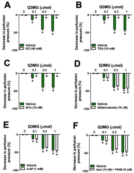 Role of K+ channels in the vasorelaxant effect of Q3MG. Effects of Q3MG on MVBs continuously perfused with 40 mM KCl (A), tetraethylammonium (TEA, (B)), iberiotoxin (IbTX, (C)), glibenclamide (D), 4-aminopyridine (4-AP, (E)), or apamin (Apm) plus TRAM-34 (F) are presented. The results show the mean ± S.E.M. of 6 preparations per group. The comparison between the different doses of Q3MG was conducted through one-way ANOVA followed by the Bonferroni test. The difference between the administration of inhibitors/antagonists and the perfusion with the vehicle only, at each dose, was performed using the Student’s t-test. + indicates p < 0.05 compared with the effects of Q3MG on the vehicle group. ⋇ indicates p < 0.05 compared with the respective control group. The vehicle represents the perfusion with only the physiological saline solution. All experiments were performed in the mesenteric vascular bed pre-contracted with PSS containing Phe 3 µM.