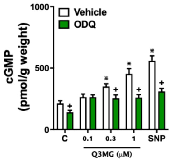 2.5. Effects of Q3MG on Intracellular Concentration of Cyclic Guanosine Monophosphate (cGMP)