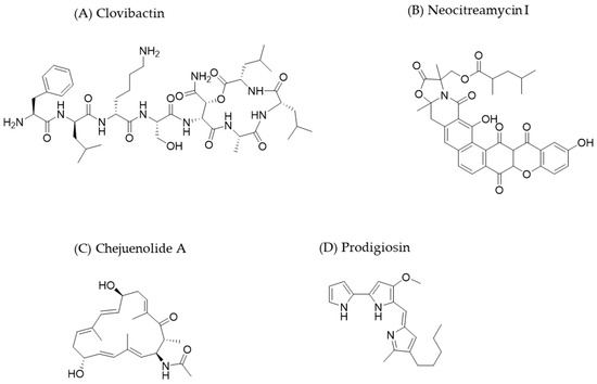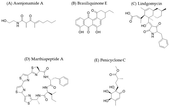 This review focuses on microbial metabolites with antibacterial activity. However, we cannot conclude this section without mentioning natural product-derived compounds used to treat infections caused by other microorganisms. These include the antifungals caspofungin and micafungin [25,26,27,28] and the antivirals cytarabine, vidarabine, and xyamicin D [29,30,31]. More recent, detailed information about novel bioactive secondary metabolites and their derivatives can be found elsewhere [10,17,31,32].