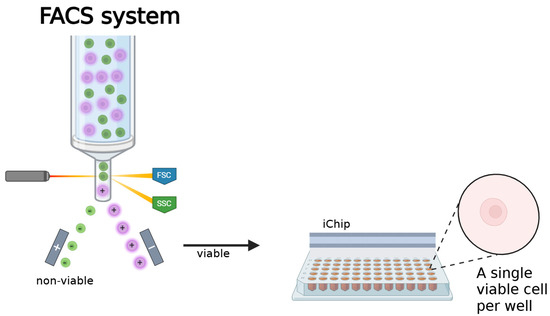 The iChip system is still being developed and improved to substantially increase its performance. One issue with the iChip is that it is unclear whether the correct distribution has been achieved. Diffusion chambers may contain zero, one, or several cells, some of which may be nonviable [77]. One of the most interesting modifications in recent years to solve this problem is the addition of a fluorescence-activated cell sorter (FACS) (Figure 5). This flow cytometry system [78] uses a laser to preselect live and dead cells, ensuring that only one viable cell is present in each well.