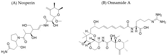 In lichens, integrated symbioses occur between the heterotrophic filamentous fungi (mycobionts) and cyanobacteria or coccoid-shaped green algae (photobionts). Kampa et al. [91] analyzed symbiotic communities attached to the lichen Peltigera membranacea. Investigating these communities presents a fundamental challenge. Photobionts can typically be grown in pure cultures, but most mycobionts (almost all of which belong to the Ascomycota phylum) cannot be propagated in vitro using conventional methods. Furthermore, intact lichens cannot be maintained artificially for long periods. To circumvent these issues, the researchers used metagenomics approaches. Specifically, they sequenced the entire genome of the P. membranacea lichen and detected candidate clusters of genes encoding polyketide synthases in the photobiont Nostoc sp. One of these clusters had homology with those involved in the biosynthesis of pederin-type family compounds. Pederin family members possess antitumor activity due to their ability to inhibit eukaryotic ribosomes [92]. Further analysis of this organism enabled the researchers to identify nosperin (Figure 6). This is a new polyketide belonging to this family that is composed of pederin and a proline-containing terminal moiety [91]. The latter region was not found in other products of this group. The results of this study reveal the potential of exploring other symbioses for drug discovery.