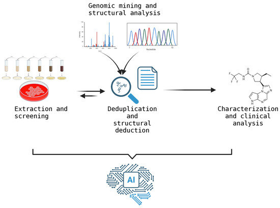 Until now, all the discussed strategies and discoveries have been based on the first step of the research process: extracting and cultivating the sample of interest. However, a significant problem has emerged, causing numerous setbacks for researchers. This problem is called replication [98], which is the continuous discovery of the same compounds over and over again. To address this issue, techniques known as deduplication have been developed and implemented [99,100]. These strategies quickly identify previously described molecules, avoiding redundancies and streamlining the process. In recent years, developing these strategies has required computational improvements and the use of artificial intelligence (AI) [101,102] (Figure 7).