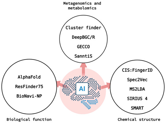 Artificial intelligence applications in the discovery of novel natural products. These include (1) metagenomics and metabolomics; (2) biological function prediction; (3) chemical structure elucidation. The figure was created in BioRender (https://app.biorender.com/, accessed on 3 July 2025).
