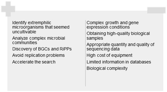 Metagenomics is a multipurpose technique, but it can present problems related to the tools required for DNA analysis of samples, such as costly sequencing machinery, specialized labor, and logistical difficulties. There are also important limitations. These include low resolution, biased classification of short sequences, and functional errors due to the misinterpretation of genes. Other shortcomings include the difficulty of obtaining high-quality DNA from extremophiles due to their cellular resistance to cleavage and possible gene cloning errors in hosts such as E. coli or other biological systems, where bioactive compounds are not always produced correctly [95]. Additionally, the presence of environmental extracellular DNA in samples can complicate metagenomic analyses and lead to an overestimation of diversity. In their review article, Bairoliya et al. describe the importance of considering this factor when interpreting experimental results and outline methods for extracting and quantifying this DNA [96]. A significant drawback is the quantity and quality of the data analyzed using bioinformatics tools after sequencing is complete, as well as the limited information about antibiotic resistance genes in existing databases [83]. During metagenomic analysis development, false positives and false negatives may be encountered. False positives are identified based on experimental factors, such as sample contamination and DNA manipulation during extraction, handling, preservation, and sequencing. Computational factors related to reference-based metagenomic profilers also contribute to false positives [97]. These types of problems can also result in false negatives.
