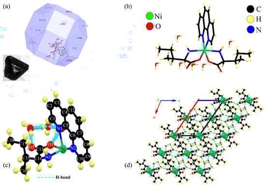 (a) Morphology and growth habit of [Ni(Phen)(Ile)2]∙6H2O crystal. (b) Molecular structure. (c) Symmetric monomer with labels and hydrogen bonds (dashed light blue line). (d) Super unit cell (3 × 3 × 3) and its primitive cell along the b-axis.