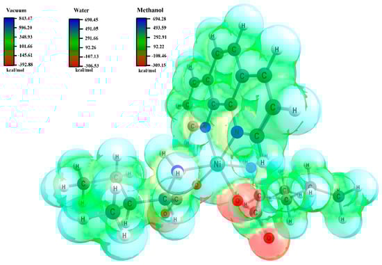 DFT calculations in vacuum and solvation media (water and methanol) were performed to generate the electrostatic potential (ESP) map of the [Ni(Phen)(Ile)2] complex, identifying regions with the highest interaction potential and electron density (see Figure 6) []. The red-colored regions, predominantly localized on the oxygen atoms of Ile, represent nucleophilic (electron-rich) sites with negative potentials, indicating a tendency to donate electrons and interact with positive regions of other molecules. This is supported by the following calculated values: −392.88 kcal/mol (vacuum), −306.53 kcal/mol (water), and −309.15 kcal/mol (methanol). Conversely, blue/green surfaces correspond to intermediate-to-positive electrostatic potentials, distributed around the metal ion and Phen rings, as evidenced by the maximum energies of 843.47 kcal/mol (vacuum), 690.45 kcal/mol (water), and 694.28 kcal/mol (methanol). Overall, no significant variations were observed in the ESP surfaces across the different environments.