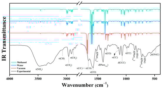 Experimental IR spectrum of [Ni(Phen)(Ile)2]∙6H2O powdered crystal compared with the calculated spectra in vacuum, water, and methanol.