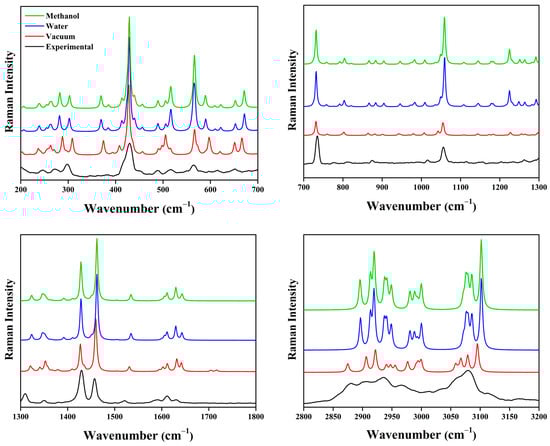 Vibrational spectroscopy (FT-IR/Raman) was employed to validate the XRD-derived structure of [Ni(Phen)(Ile)2] and characterize its functional groups. The experimental spectra were compared with the PBE1PBE/6-311++G(d,p)/SDD calculations (scaling factors: 0.9594–0.9812) [] in vacuum, water, and methanol environments (Table A5, Figure 7 and Figure 8). The vibrational assignments used the VMARD ≥ 9% criteria [].