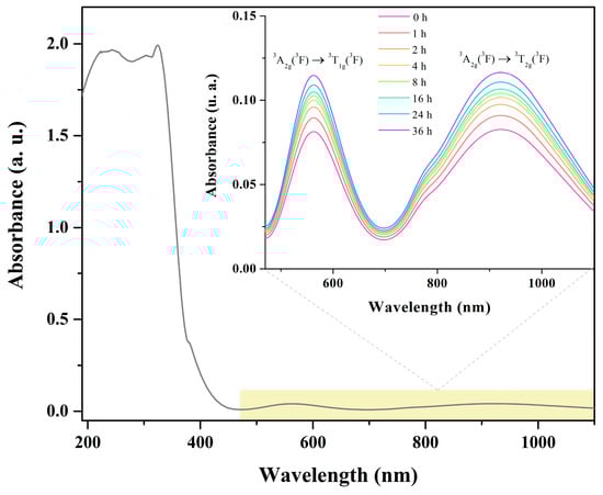 UV–Vis–NIR spectrum of the [Ni(Phen)(Ile)2]∙6H2O complex in a deionized water/ethanol (1:1) mixed solvent system, recorded in the 190–1100 nm range. Inset: time-dependent (36 h) UV–Vis–NIR spectra of [Ni(Phen)(Ile)2]∙6H2O in aqueous solution.