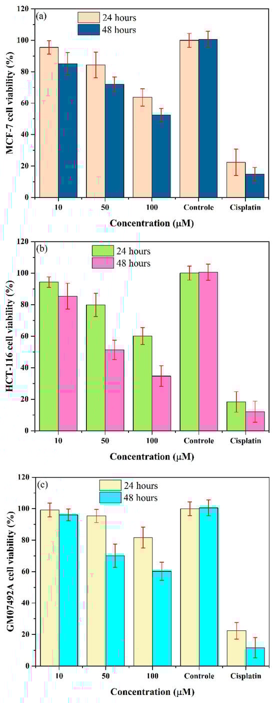 Cell viability of [Ni(Phen)(Ile)2]∙6H2O powdered crystal over 24 and 48 h period in cell lineages: (a) MCF-7, (b) HCT-116, and (c) GM07492A.