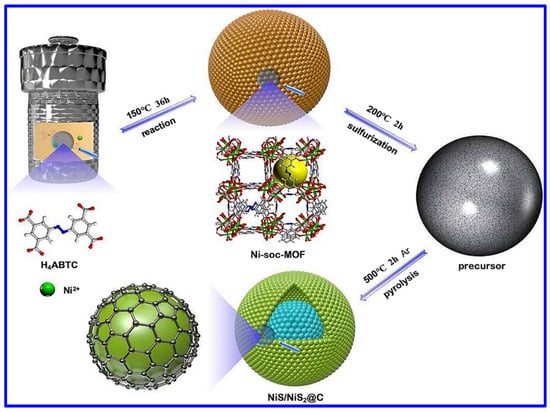 The NS and NMS materials have been extensively synthesized through versatile synthetic approaches. Among them, the most common synthetic approach is the hydrothermal process. It is important to note that such a specific synthetic route has not only been employed for synthesizing NS and NMS-based powder materials but also explored to grow such materials in various conductive substrates; for example, Ni foam (NF). In this aspect, Yan et al. reported the hydrothermal synthesis of NiS nanosheets on NF [39]. In a typical process, the Ni-based salt, Ni(NO3)2, along with urea and NF, was hydrothermally treated at 180 °C for 18 h at a heating rate of 3 °C/min. In the next step, the coated foam was further hydrothermally heated at 120 °C for 3 h along with Na2S, which was used as the S-source. The morphological analysis confirmed the growth of NiS nanosheets. In another work, β-NiS was hydrothermally synthesized using Ni(CH3COO)2·4H2O salt [40]. However, in this case, the reaction temperature was set at 150 °C for a reaction time of 12 h for the synthesis of metal sulfide nanoparticles. The hydrothermal synthetic approaches associated with the post-heat treatment are reported for synthesizing various NS-based materials with diverse morphologies and related composites. The metal–organic framework (MOF)-derived NS materials have also been synthesized through this approach. In this aspect, Wang et al. demonstrated the hydrothermal-assisted synthesis of an MOF-derived NiS/NiS2@carbon composite, as shown in Figure 2 [41]. For the MOF synthesis, 3,3′,5,5′-azobenzenetetracarboxylic acid (H4ABTC) was used, and the MOF-derived NS material was synthesized through pyrolysis at 500 °C in an Ar atmosphere. Hydrothermal synthesis was further employed for the synthesis of the composite based on Cu2S, NiS, Ni3S4, and MnO2 [42]. In another work, P-doped Co3S4 was combined with Ni3S4 on NF through a two-step hydrothermal approach, where NaH2PO2 was utilized as the doping agent in the phosphating method [43].