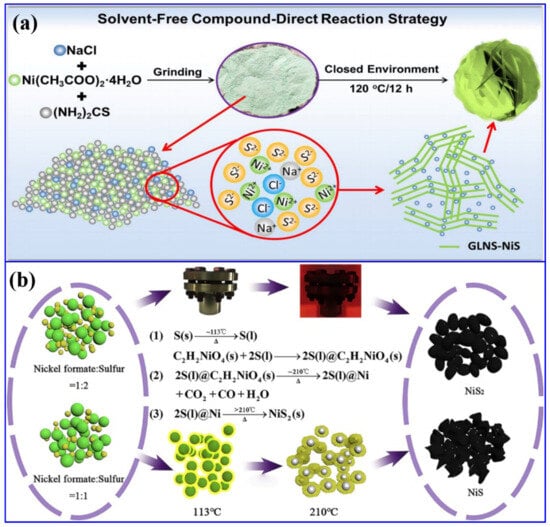 Solid-state synthesis of NS-based materials: (a) schematics of the solvent-free synthetic approach of graphene-like ultra-thin NiS nanosheets (GLNS-NiS) [44]; (b) schematics and the related reactions for the synthesis of NiS and NiS2 [45].
