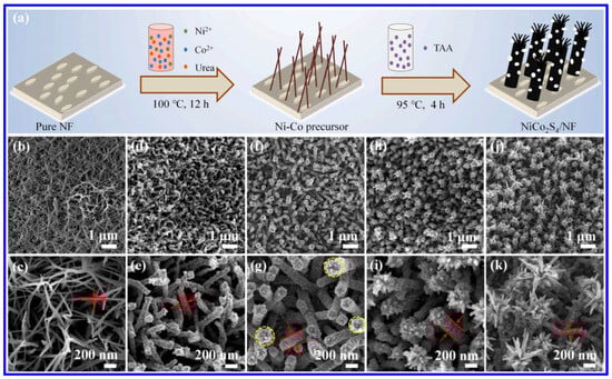 (a) Schematics of the hydrothermal synthesis of NiCo2S4 on NF; the SEM images of various NiCo2S4-coated NF after hydrothermal treatment of different time intervals: (b,c) Ni-Co precursor (after first hydrothermal treatment); (d,e) NiCoS-2 (after second hydrothermal reaction time of 2 h); (f,g) NiCoS-3 (after second hydrothermal reaction time of 3 h); (h,i) NiCoS-4 (after second hydrothermal reaction time of 4 h); (j,k) NiCoS-5 (after second hydrothermal reaction time of 5 h) [50].