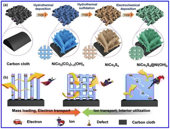 (a) Schematics of NiCo2S4/Ni(OH)2 meshes on carbon cloth, and (b) the advantages of forming such a composite in the field of SC [56].