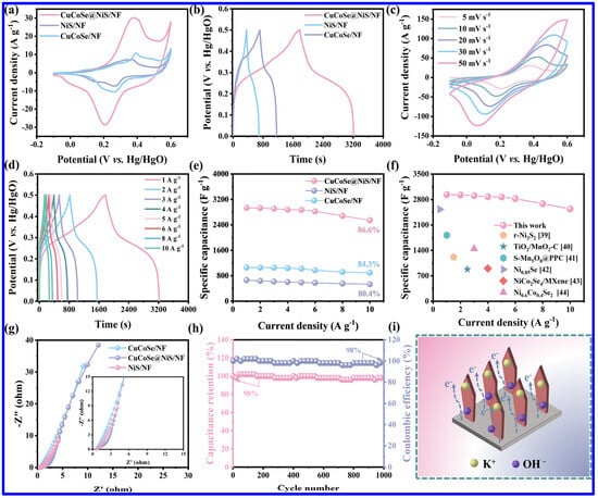 The SC performance of CuCoSe/NiS/NF composite and related electrode materials: (a) CV curves at 5 mV s−1, (b) GCD profiles at 1 A g−1 of NiS/NF, CuCoSe/NF and CuCoSe/NiS/NF; (c) CV curves and (d) GCD profiles of CuCoSe@NiS/NF; (e) Csp at different CDs for all electrodes; (f) comparison of the Csp of CuCoSe/NiS/NF and some related, reported electrodes; (g) Nyquist plots of all electrodes; (h) the CS curve of CuCoSe/NiS/NF, measured at 15 A g−1; (i) schematic representation of the electron and ion transport of CuCoSe/NiS/NF electrode during the charge–discharge process [63].