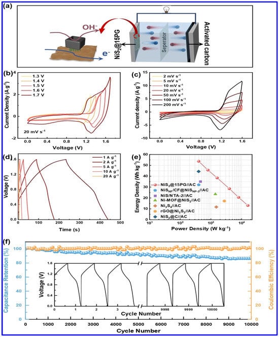 The electrochemical performance of NiS2/PANI/graphene oxide composite (NiS2@15PG)-based hybrid SC device: (a) Schematics of the device based on NiS2@15PG as positive and AC as negative electrode, (b) CV profiles at different voltages (20 mV s−1), ranging from 1.3 to 1.7 V, (c) CV curves at different scan rates (SRs), (d) GCD profiles at different CDs, (e) the Ragone plot, (f) the CS curve [65].