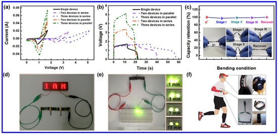 The electrochemical performance of the flexible NiCo2S4/Ni(OH)2//Fe2O3 device: the (a) CV and (b) GCD curves of the devices connected in series or in parallel at SR of 20 mV s−1 and CD of 50 mA cm−2, respectively; (c) the plot of capacity retention of the device at different bending angles, demonstrating superior flexibility, (d) the digital images of three flexible devices, connected in series, lighting red LED display, (e) the image of the glow up of yellow LED with the series connection of two flexible devices, and (f) the image of three in series connection for functioning a headphone and an electronic watch [56].