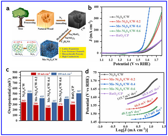 In another work, Zhou et al. synthesized a Ni3S2/NiFe-(oxy) hydroxide (NiFeOxHy) heterostructure nanosheet array that exhibited outstanding OER performance with ultralow OPs of 209 mV and 243 mV to achieve the current densities (CDs) of 50 and 100 mA cm−2, respectively (Figure 9d–f). These values are found to be lower than those of Ni3S2 (480 mV and 534 mV), NiSO (397 mV and 440 mV), NiFeO (321 mV and 355 mV), commercial IrO2 (406 mV and 455 mV), and NF (466 mV and 551 mV), demonstrating superior catalytic activity. Notably, Ni3S2/NiFeOxHy outperformed even the commercial IrO2 catalyst. The Tafel slope of Ni3S2/NiFeOxHy was 79.8 mV dec−1 at high CD (~100 mA cm−2), which is much smaller than those of Ni3S2 (194.6 mV dec−1), NiSO (182.7 mV dec−1), NiFeO (140.8 mV dec−1), IrO2 (188.9 mV dec−1), and NF (299.3 mV dec−1), indicating faster OER kinetics (Figure 9f). This remarkable activity arose from the synergistic coupling between Ni3S2 and NiFeOxHy phases, which enhanced charge transfer, increased the density of active sites, and improved overall stability [78]. On the other hand, Shi et al. synthesized molybdenum-doped Ni3S4 nanosheets grown on carbonized wood (Mo-Ni3S4/CW) [79]. The synthetic approach is schematically shown in Figure 10a. The theoretical calculations revealed that Mo-doping caused lattice expansion in Ni3S4, which optimized the adsorption energies of hydrogen and oxygen species. This adjustment regulated the local charge density at active sites, thereby enhancing the OER activity (Figure 10b). The Mo-Ni3S4/CW-0.4 catalyst exhibited OPs of 240 mV and 337 mV to reach CDs of 10 and 100 mA cm−2, respectively, outstripping undoped Ni3S4/CW (η10 = 343 mV) (Figure 10c). Moreover, Mo-Ni3S4/CW-0.4 showed the lowest Tafel slope of 47.7 mV dec−1, indicating superior OER kinetics compared to Ni3S4/CW (115.7 mV dec−1) and even commercial RuO2 (66.6 mV dec−1) (Figure 10d).