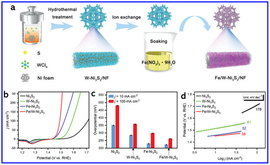 Metal-doping is another strategy for enhancing the catalytic activity of NS materials. In this context, Prakash et al. synthesized Zn-doped NiS nanosheets on NF using a simple hydrothermal method [80]. The optimized sample, Zn-NiS-3, exhibited the best OER performance, achieving an OP of 320 mV at a CD of 50 mA cm−2, which is significantly lower than that of undoped NiS. The enhanced catalytic activity is attributed to the incorporation of Zn, which likely improves the electronic structure and promotes charge transfer during the oxygen evolution reaction. In another work, Wang et al. developed a dual-doped NS catalyst (Fe/W-Ni3S2) grown on NF, exhibiting significantly enhanced OER performance [81]. The hydrothermal-assisted ion-exchange process was adopted to grow the doped NS material on NF, as shown in Figure 11a. The improved activity is attributed to the synergistic effect between iron doping and nickel vacancies introduced by tungsten leaching during the in situ oxidation process. This combination maximizes the exposure of active OER sites and enhances charge transport, thereby accelerating the reaction kinetics (Figure 11b). The Fe/W-Ni3S2 catalyst achieved low OPs of 222 mV and 261 mV at CDs of 10 and 100 mA cm−2, respectively, outperforming Fe-Ni3S2 (229 and 298 mV), W-Ni3S2 (284 and 358 mV), and undoped Ni3S2 (350 and 479 mV) (Figure 11c). It also exhibited the lowest Tafel slope of 38 mV dec−1, compared to 52, 61, and 178 mV dec−1 for Fe-Ni3S2, W-Ni3S2, and Ni3S2, respectively, confirming its enhanced OER kinetics (Figure 11d). These findings demonstrate that dual doping is an effective strategy for boosting the catalytic performance of NS materials.