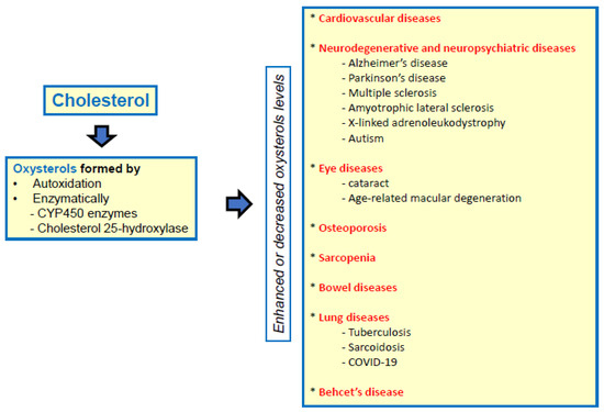 There is substantial evidence that oxysterols can adversely affect certain major and vital organs such as the heart, brain, blood vessels, bones, pancreas, and eyes [30]. These oxysterols might play a role in the development and course of chronic illness [30,31] and also of infectious diseases, especially COVID-19 [32,33] (Figure 1). Actually, a number of clinical studies have shown that people with type 2 diabetes, obesity, hypercholesterolemia, and atherosclerosis have higher levels of various oxysterols [34,35]. These can be used as useful indicators to diagnose certain pathologies, or to forecast the occurrence and progression of diseases such as cardiovascular diseases, Alzheimer’s disease, diabetes mellitus, multiple sclerosis, osteoporosis, lung cancer, breast cancer, and infertility [36]. In addition, some oxysterols could be also used as biomarkers of some rare diseases such as X-linked adrenoleukodystrophy (X-ALD) [37] and Niemann–Pick disease [38,39]. It is noteworthy that oxysterols involved in inflammatory diseases have often simultaneously pro-oxidant and pro-inflammatory properties contributing to the aggravation of symptoms via an overproduction of pro-inflammatory cytokines at the system level or in the tissues affected by the disease [40,41,42].