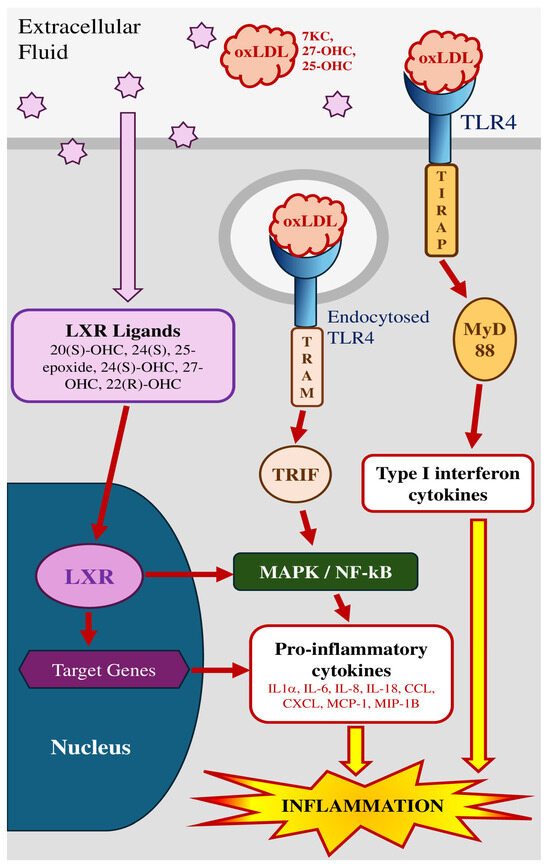 In human atherosclerotic plaque-derived monocytes and macrophages, 25-OHC contributes to the production of foam cells and stimulates the release of pro-inflammatory cytokines and chemokines, including IL-1, IL-6, IL-8, CCL5, and M-CSF. However, in certain situations, 25-OHC can block the Akt/NFB signaling pathway, induce IFN, repress SREBP, and antagonize inflammasomes, all of which can reduce the activity of inflammasomes [50].