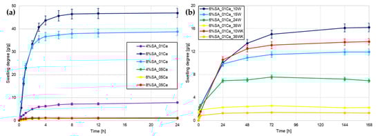 Swelling degree curves for different hydrogels: (a) hydrogel matrices; (b) SA hydrogel/wool composites.