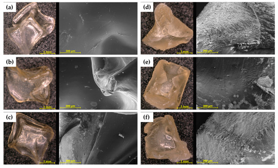 The microscopic images (Figure 2) immediately show the difference in colour and shape between hydrogels cross-linked with 0.1 and 0.5 M CaCl2 solution. The hydrogels 4%SA_05Ca, 6%SA_05Ca, and 8%SA_05Ca are less transparent and their shape was strongly deformed during drying. SEM observation confirmed all previous findings of poor swelling in these hydrogels. Figure 2d–f show a collapsed structure and compacted layers of the hydrogel network. Such a compressed structure could have made it difficult for water to enter during swelling. Compared to them, hydrogels cross-linked with 0.1 M CaCl2 in the images come out smooth with an even structure.