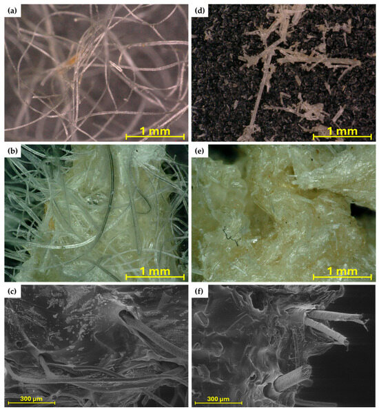 Sheep wool used in studies can be seen in Figure 3a,d. Figure 3b,e show hydrogels made with two types of wool. The hydrogel with the addition of cryogenically milled wool (Figure 3e) has a more compact texture due to the size of the micrometric fibres and the individual fibres do not extend beyond the hydrogel matrix.