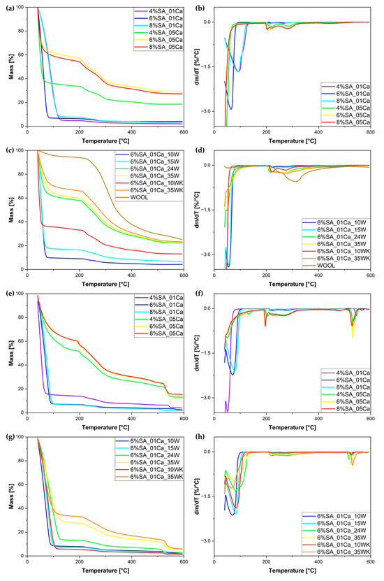 TG (a,c,e,g) and DTG (b,d,f,h) curves for obtained hydrogel matrix under nitrogen atmosphere (a,b), SA hydrogel/wool composites under nitrogen atmosphere (c,d), hydrogel matrix under air atmosphere (e,f), and SA hydrogel/wool composites under air atmosphere (g,h).