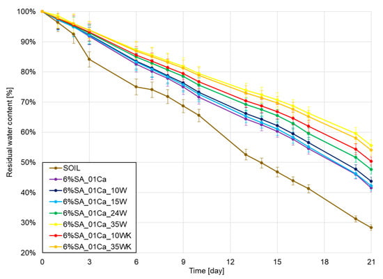In the very end, water retention was checked under laboratory conditions in the soil over a period of three weeks, and the results of water loss are shown in Figure 7. As expected, all hydrogels improved retention in relation to the soil. With a small addition of wool, no differences were observed with respect to the hydrogel alone, but it should be remembered that in this case the addition of wool may still be beneficial due to the incorporation of the waste and the addition of a natural nitrogen source. A large amount of wool further improves water retention relative to that of the hydrogel alone, despite a weaker degree of swelling in aqueous environments. This may be due to the observed more difficult evaporation from the deformed structure of the hydrogel as well as the fibre itself.