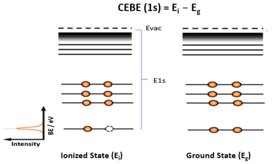 The CEBE of a molecule refers to the energy required to remove a core electron from an atom or a molecule. It is a fundamental quantity measured by XPS and plays a key role in characterizing the electronic structure, chemical bonding, conjugation, local electronic effects, and oxidation states of molecules and materials. Figure 2 provides an illustration of the core electron ionization process. Unlike valence ionization energies, CEBEs are rarely calculated using the Koopman theorem or meta-Koopman theorem if DFT methods are applied [29].