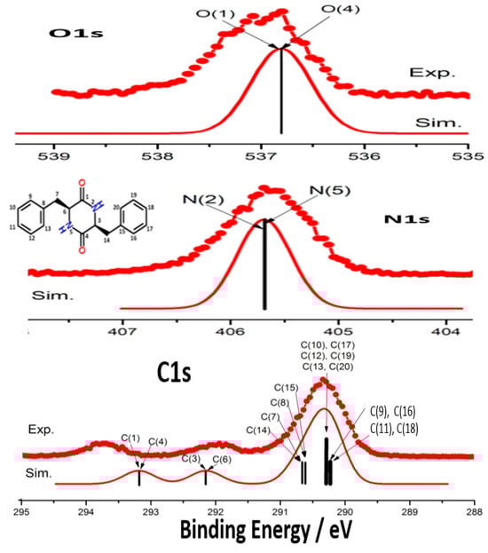 As a result, Method C in Equations (6) and (7) has been applied to many molecules since the beginning of this century (2002), providing essential theoretical support to XPS experiments and their assignment [1,26,52,69]. The encouraging results were also summarized in a recent paper [71]. The calculation of CEBEs for molecules containing C1s, N1s, O1s, and F1s has been well documented [72]. With the development of synchrotron-sourced XPS in the gas phase in the early 2000s, accurate CEBE calculations became important in the interpretation of the measured C1s, N1s, and O1s XPS spectra of medium-sized molecules such as amino acids [73,74,75,76,77,78], DNA bases [10,16,76,79], dipeptides [13,80], and other biologically important molecules [81,82], drugs [83,84,85], drug candidates [86,87] and energy storage materials [88,89,90] with high accuracy. Figure 3 presents the comparison of C1s, N1s, and O1s XPS measured in the gas phase and the calculated CEBE of cyclo-phenylalanyl–phenylalanine using Method C in Equation (6) [13].