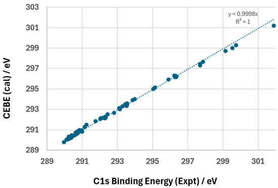 The calculated and measured CEBEs of the molecules in the database in Table 3 agree well (second last column), particularly in the top 59 cases, except for the bottom 9 cases (highlighted in the table). The Cartesian coordinates of all optimized structures are provided in Table S1 of the Supplementary Materials. Figure 4 compares the correlation between the calculated and measured values of all 68 C1s CEBEs of the small molecules in Table 3. It demonstrates an exceptional level of accuracy, with the linear regression correlation coefficient R2 value of ~1.000, indicating that the computed CEBEs agree well with the measured ones. Furthermore, the fitted equation of y = 0.9998x shows that the calculated values deviate negligibly from the experimental data, with a slope nearly equal to 1. This result validates the reliability of the computational method employed, confirming that the DFTpw functional combined with the chosen basis set provides highly accurate predictions of CEBEs for these molecules.
