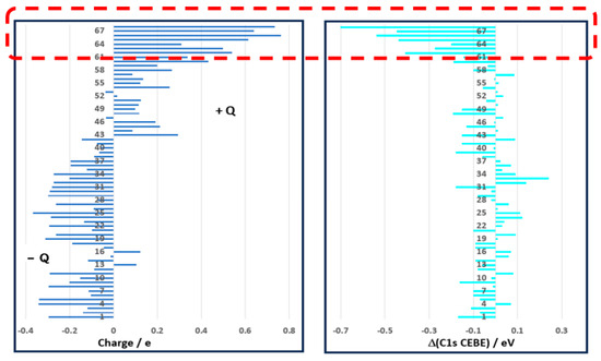 As indicated by Domagala et al. [63] that the DFT method undoubtedly has the greatest problems with a reliable description of the electron density distribution in multiple strongly polar bonds, such as C=O, and bonds associated with large electron charge delocalization. Our analysis suggests that the accuracy of the target C1s CEBEs is primarily influenced by the polarity of the individual C-X bonds, as reflected in the Mulliken charge Q on the carbon atom. Figure 5 correlates the calculated Mulliken charge (Q) on carbons (left) and the access Δ(C1s CEBE) (right) on the target carbon atom of the molecules. A key observation is that when the target carbon atom carries a large positive Mulliken charge (e.g., greater than Q > 0.3 e), the deviations between DFT-calculated and experimental C1s CEBEs (Δ(DFT − Expt)) tend to be more pronounced. This trend is particularly evident for the bottom nine C1s CEBEs with the largest discrepancies, as indicated in the dashed box in Figure 5. Here, it is the charge, not the dipole moment of the molecules, that matters as molecular symmetry may cancel out individual bond polarities, leading to a zero dipole moment in highly symmetric molecules, such as CO2. The charge on C is as large as 0.5394 e, but the linear symmetry of CO2 results in a non-dipole molecule of CO2. Similarly, the C-F bonds of CF4 are strong polar bonds, and the charge accumulated on the C atom is as large as 0.7352 eV, but due to the tetrahedral symmetry, the dipole moment of CF4 is zero. As indicated in Figure 5, there is a general negative correlation between the charge on the target carbon atom (Q > 0) and the Δ(C1s CEBE) < 0. That is, the more positive charge on a carbon atom, the larger the error of the calculated C1s CEBE with respect to the measured one. For example, the largest charge on the target carbon atom is Q = +0.7352 eV of CF4, and the Δ(C1s CEBE (DFT − Expt)) is as large as −0.71 eV, which is also the largest (negative) C1s CEBE discrepancy in Table 3.