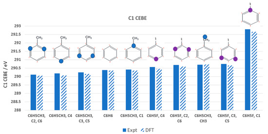 Comparison of C1s CEBEs of the mono-substituted benzenes (toluene and florobenzene) with respect to their corresponding measured C1s energies (eV) (RMSD = 0.0897 eV).