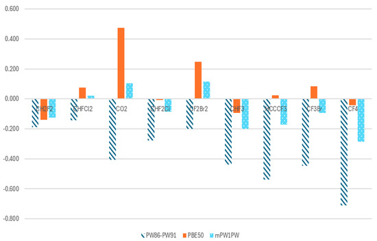 Figure 7 presents a comparison of the C1s CEBEs for the last nine cases of molecules with strongly polar C-F(O) bonds. Incorporating a higher proportion of Hartree–Fock (HF) exchange, the PBE50 functional significantly improves accuracy, reducing the AAD from 0.38 eV (Table 3) to 0.13 eV (Table 4)—a nearly threefold improvement. This highlights the crucial role of exchange treatment in DFT functionals when addressing highly polar bonds in XPS calculations. As shown in Figure 7, both the PBE50 and mPW1PW functionals effectively reduce errors in C1s CEBE calculations using Method C. For most cases, PBE50 performs well, keeping Δ(DFT − Expt) below 0.20 eV, except for two notable exceptions: CO2 and CF2Br2. The Δ(DFT − Expt) for CO2 is 0.475 eV, even larger than the deviation obtained with DFTpw (−0.407 eV). Similarly, CF2Br2 shows an error of 0.247 eV, again exceeding the value from DFTpw. These results suggest that 50% HF exchange in PBE50 does not fully capture the electronic effects in these particular systems. In contrast, the mPW1PW functional exhibits a different performance trend, reducing the Δ(DFT − Expt) for CO2 and CF2Br2 to 0.104 eV and 0.115 eV, respectively. However, this functional introduces larger errors for other molecules, with deviations of −0.286 eV for CF4 and −0.201 eV for CHF3. This indicates that while mPW1PW improves accuracy for some systems, it still struggles with strongly polar fluorinated molecules, underscoring the trade-offs in functional selection for CEBE calculations.