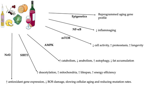 Moreover, polyphenols may induce epigenetic modifications with a synergistic action with microRNAs [76,77,78,79], thus regulating gene expression patterns related to aging. This multifaceted approach allows polyphenols to subtly remodel cellular homeostasis and participate in a healthier and longer lifespan (Figure 1).