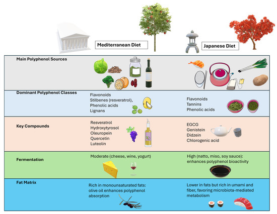 Relationship between Mediterranean and Japanese polyphenol contents. The Mediterranean and Japanese diets are both associated with exceptional health benefits and longevity, and a key shared feature is their high content of polyphenols. However, these diets differ in polyphenol sources, types, and patterns of consumption, leading to distinct metabolic profiles and potentially complementary effects on aging and disease prevention. EGCG, epigallocatechin gallate. Parts of the figure were drawn by using pictures from Servier Medical Art and Microsoft PowerPoint 365 Version 2112 (https://www.microsoft.com/microsoft-365, accessed on 29 June 2025). Servier Medical Art by Servier is licensed under a Creative Commons Attribution 3.0 Unported License (https://creativecommons.org/licenses/by/3.0/, accessed on 29 June 2025).