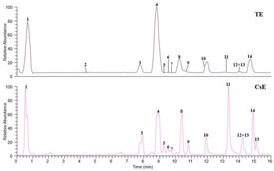 HR-LC-MS profiles of saffron tepal extract (TE) and saffron waste extract (CsE), recorded in negative ESI mode. Each number corresponds to an annotated molecule listed in Table 1.