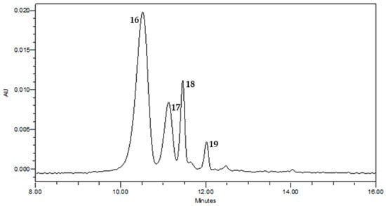 Below (Figure 2), an HPLC-DAD chromatogram of the tepals extract is shown relative to anthocyanins, whose signals are more intense because the sample amount is larger than that analyzed using LC-MS. The compounds were identified using the same method used for the analytes in Table 1. Four anthocyanins (16–19, Figure 2)—previously reported in the literature as saffron bioresidue constituents by Serrano-Díaz et al., 2014 [14] and Cusano et al., 2017 [2]—were identified and confirmed using HR-MS2 data. Compounds 16 and 18 were annotated as delphinidin 3,5-di-O-glucoside (16) and delphinidin 3-O-glucoside (18), as deduced by a base ion peak at m/z 303.05 due to the aglycon portion of delphinidin and generated by the loss of one or two glucose residues, respectively (Table 2). Similarly, compounds 17 and 19 were annotated as petunidin 3,5-di-O-glucoside (17) and petunidin 3-O-glucoside (19), showing a base ion peak at m/z 317.06 corresponding to the aglycon portion of petunidin [27].