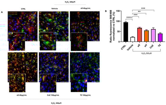 Extract efficacy assays following oxidative stress induced by H2O2 damage. Panel (A) shows cells stained with MitoLight, a mitochondrial marker that shifts from red to green in response to changes in membrane potential. In CTRL conditions, untreated cells exhibit intact mitochondrial membranes, as indicated by the red fluorescence, meaning that the dye remains localized within the mitochondria (the arrows indicate the mitochondria labelled in different colours according to their oxidative state). The vehicle, representing the pathological control, consists of cells exposed to H2O2 500 µM in culture medium. These cells display significant mitochondrial depolarization, as evidenced by the shift from red to green/yellow fluorescence. Panel (B) quantifies the MitoLight fluorescence ratio (585/488 nm) using ImageJ Java 8, normalized to the control condition. The vehicle confirms the detrimental effect of oxidative stress and shows a significant reduction in mitochondrial membrane integrity. However, treatment with the saffron extracts partially restores mitochondrial potential, as indicated by the statistical significance of the results (** p < 0.01; *** p < 0.001; **** p < 0.0001. Scale bars = 25 µm.