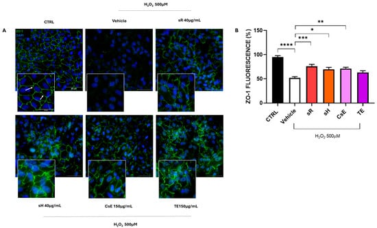 Tight junction integrity of different extracts after H2O2 damage. (A) shows ZO-1 (zonula occludens-1) immunofluorescence (green, indicated by white arrows), a key marker of tight junctions fundamental for RPE (retinal pigment epithelium) barrier integrity. The CTRL condition (untreated cells) displays continuous ZO-1 staining outlining cell borders, reflecting well-preserved tight junctions. In contrast, the vehicle group (cells exposed to H2O2 500 µM) exhibits disrupted ZO-1 staining, indicating a loss of tight junction integrity. Treatment with different saffron-based extracts—Repron® saffron extract (sR, 40 µg/mL), hydroponic saffron extract (sH, 40 µg/mL), whole-saffron-flower extract (CsE, 150 µg/mL), and saffron tepal extract (TE, 150 µg/mL)—partially restores the ZO-1 signal at the cell boundaries, suggesting a protective effect against oxidative stress. Cell nuclei are counterstained with DAPI (blue). Scale bar: 25 µm. (B) presents the quantification of ZO-1 fluorescence (expressed as a percentage of the CTRL), analyzed via one-way ANOVA (mean ± SEM, n = 4). The vehicle confirms the detrimental impact of oxidative stress, showing a marked reduction in ZO-1 expression. However, cells treated with saffron extracts exhibit significantly improved tight junction preservation (* p < 0.05; ** p < 0.01; *** p < 0.001; **** p < 0.0001).