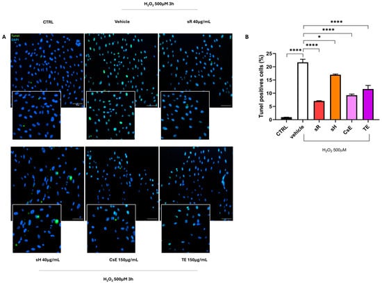 Anti-apoptotic efficacy of saffron extracts following oxidative stress induced by H2O2 damage. Panel (A) shows representative images of TUNEL staining (green), which detects the DNA fragmentation characteristic of apoptotic cells, following 500 µM H2O2 exposure for 3 h. The CTRL group (untreated cells) exhibits minimal TUNEL staining, indicating low apoptosis levels. By contrast, the vehicle group (exposed to H2O2 alone) displays a marked increase in TUNEL-positive nuclei. Treatment with saffron-based extracts Repron® (sR, 40 µg/mL), hydroponic saffron extract (sH, 40 µg/mL), whole-saffron-flower extract (CsE, 150 µg/mL), and saffron tepal extract (TE, 150 µg/mL) reduces TUNEL staining, suggesting a protective effect against oxidative damage. Cell nuclei are counterstained with DAPI (blue). Scale bar = 100 µm. Panel (B) shows the quantification of TUNEL-positive cells (percentage), an indicator of apoptotic extent. The data are presented as mean ± SEM (n = 4). One-way ANOVA was performed to assess statistical significance. The vehicle confirms the harmful impact of oxidative stress, showing a substantial increase in apoptosis. However, cells treated with saffron extracts exhibit significantly reduced TUNEL positivity (* p < 0.05; **** p < 0.0001).
