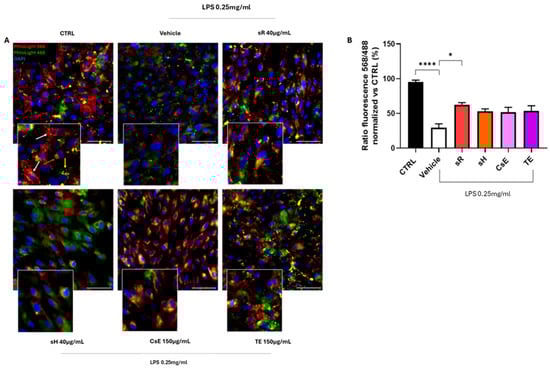 Activity of mitochondrial integrity of different extracts after LPS damage. Panel (A) shows representative images of cells stained with MitoLight. The CTRL condition (untreated cells) displays predominantly red fluorescence, indicative of intact mitochondrial membranes (the arrows indicate the mitochondria labelled in different colours according to their oxidative state). Exposure to LPS (0.25 mg/mL) leads to partial mitochondrial depolarization, visible as a shift toward green/yellow fluorescence. By contrast, treatment with saffron-based extracts—Repron® saffron extract (sR, 40 µg/mL), hydroponic saffron extract (sH, 40 µg/mL), whole-saffron-flower extract (CsE, 150 µg/mL), and saffron tepal extract (TE, 150 µg/mL)—helps preserve mitochondrial membrane integrity. Cell nuclei are counterstained with DAPI (blue). Scale bar = 25 µm. Panel (B) presents the MitoLight fluorescence ratio (568/488 nm) normalized to the CTRL condition, analyzed using ImageJ. Data are expressed as mean ± SEM (n = 4). Statistical significance was determined via one-way ANOVA (* p < 0.05, **** p < 0.0001).