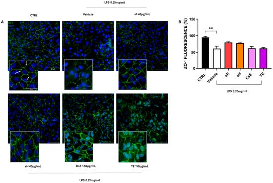 Activity of tight junction integrity of different extracts after LPS damage. (A) shows immunostaining for ZO-1 (green, indicated by white arrows). The CTRL (untreated) condition exhibits continuous ZO-1 staining outlining cell borders. By contrast, the vehicle group (exposed to LPS 0.25 mg/mL) demonstrates disrupted ZO-1 distribution, indicative of compromised tight junctions. Treatment with saffron-based extracts—Repron® saffron extract (sR, 40 µg/mL), hydroponic saffron extract (sH, 40 µg/mL), whole-saffron-flower extract (CsE, 150 µg/mL), and saffron tepal extract (TE, 150 µg/mL)—partially restores ZO-1 localization at cell boundaries, suggesting a protective effect against inflammatory stress. Cell nuclei are counterstained with DAPI (blue). Scale bar = 25 µm. (B) quantifies ZO-1 fluorescence (percent of CTRL), serving as a measure of tight junction integrity. Data are expressed as mean ± SEM (n=4) and analyzed via one-way ANOVA. (** p < 0.01).