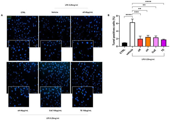 Figure 6 shows the results obtained for ARPE-19 cells following damage induced by incubation in a medium containing 0.25 mg/mL of LPS. In this case, Panel A illustrates the evaluation of the effectiveness of extracts obtained from saffron and its by-products in protecting cells from mitochondrial damage induced by LPS treatment. The healthy control (CTRL) cells exhibit predominantly red labeling, indicating mitochondrial membrane integrity. In contrast, damaged cells treated only with vehicles show predominantly green labeling, which indicates mitochondrial damage and dysfunction. These findings are fully consistent with the data shown in Figure 3. The labeling pattern changes on the extract source in the panels displaying the different treatments. Cells treated with saffron Repron® (sR) exhibit more red labeling, whereas cells treated with hydroponic saffron (sH), whole-flower extract (CsE), and tepal-only extract (TE) predominantly show green labeling. These observations, summarized in Panel B, indicate that in the case of LPS-induced inflammation, the only extract with a significant ability to preserve mitochondrial integrity and functionality is saffron Repron®. Figure 7 illustrates the integrity of cell junctions through ZO-1 labeling. As shown in Panel A, CTRL cells display a green labeling pattern typical of epithelial morphology. Upon exposure to inflammatory stress (vehicle), ZO-1 labeling becomes highly fragmented and discontinuous. Although the panels for the various treatments show that labeling is partially preserved, indicating some degree of stress protection, no significant values are reached when ZO-1 fluorescence is quantified (Figure 7B). The protective effect of saffron extracts on mitochondrial status and the preservation of cell junctions, although not reaching statistical significance, still reduces the apoptotic process, as evidenced by the results obtained through TUNEL analysis. In Figure 8A, a reduction in green labeling can be observed, indicating TUNEL+ cell nuclei. In the bar graph in Panel B, it is clear that treatment with the different tested extracts protects the cells from apoptosis, significantly reducing their percentage.