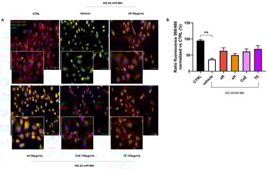 Saffron extract efficacy under hyperglycemic conditions in preserving mitochondrial membrane integrity. Panel (A) shows representative images of cells stained with MitoLight after glucose 25 mM exposure for 96 h. The CTRL group (normal glucose) displays predominantly red fluorescence, indicating intact mitochondrial membranes. The vehicle group (glucose 25 mM) shows increased green/yellow fluorescence, signifying mitochondrial depolarization. Treatment with saffron-based extracts—Repron® saffron extract (sR, 40 µg/mL), hydroponic saffron extract (sH, 40 µg/mL), whole-saffron-flower extract (CsE, 150 µg/mL), and saffron tepal extract (TE, 150 µg/mL)—preserves mitochondrial membrane potential. Cell nuclei are counterstained with DAPI (blue). Scale bar = 25 µm. Panel (B) presents the ratio of MitoLight fluorescence (568/488 nm), normalized to CTRL, quantified using ImageJ. Data are expressed as mean ± SEM (n=4) and analyzed via one-way ANOVA (** p < 0.01). The vehicle confirms the damaging effect of hyperglycemia on mitochondria, whereas cells treated with saffron extracts exhibit partially restored membrane potential, supporting a protective role for these extracts under hyperglycemic conditions.