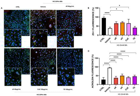 Cells were plated in an 8-well chamber slide at a density of 1 × 104 cells per well and treated according to the previously outlined protocols. After treatment, the cells were fixed with 2% paraformaldehyde for 15 min at room temperature, permeabilized with a solution containing 2.5% bovine serum albumin (BSA) and 0.3% Triton X-100 for 10 min, and then blocked with 2.5% BSA for 1 h. The cells were incubated overnight at 4 °C with primary antibodies against ZO-1 (Invitrogen, cod. 61–7300, Thermo Fisher Scientific, Waltham, MA, USA, 1:500) and acrolein (Abcam, cod. ab48501, Cambridge, UK, 1:1000). The next day, the cells were exposed to the appropriate fluorescent secondary antibodies for 2 h at room temperature. Finally, the cells were counterstained with DAPI, washed three times with PBS, imaged, and analyzed as previously described.